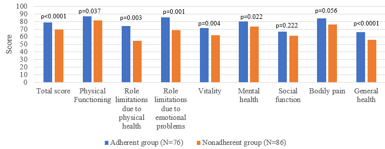 Figure 1. The 36-Item Short Form Survey scores and its domains between adherent and nonadherent groups of transfusion-dependent thalassemia (TDT) patients with p-value (Mann-Whitney U test) |