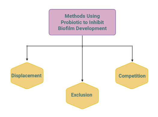 Probiotics can suppress the proliferation of microorganisms and prevent biofilm development using certain methods which are displacement, exclusion, or competition, and are displayed in Figure 4 in a Flow Diagram [9].