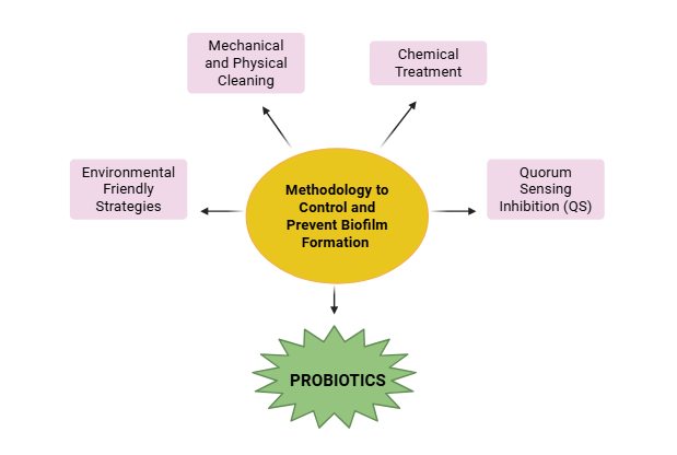 All these methods discussed above have some disadvantages which make them unable to be used in certain cases. The properties of the surface being cleaned, the type of biofilm, the strength of the cleaning agents, and the length of time and temperature of the CIP (Clean-in-Place) process all affect how effective the cleaning process is [37]. In the case of Chemical treatment, the dosage and the timing concerning these chemical products are typically adjusted to eradicate aquatic plankton bacteria, making them potentially ineffective against biofilms [34]. In addition, biofilms exhibit greater resistance to certain biocidal agents, such as chlorine-containing and quaternary ammonium sanitizers [6]. While dealing with Environmentally friendly methods the bacteriophages have shortcomings in effectively directing against microbes within biofilms because of the presence of the extracellular matrix. Some of the essential oils may irritate the dermis and internal human system [6]. QS inhibition can occur via a number of methods. Autoinducers (AI) are QS signaling molecules that inhibitors can bind to competitively, quorum-quenching enzymes can degrade AI signals, small regulatory RNAs (sRNAs) can post-transcriptionally modulate QS genes, and AI can be directly blocked. QS genes can be inhibited and the QS mechanism suppressed by interfering with just one element of the QS pathway [38]. All conventional methods to control biofilm formation have certain limitations. Probiotics have therefore become a viable substitute tactic to prevent biofilm formation in the food sector, lowering the possibility of antibiotic resistance linked to foodborne infections [5].