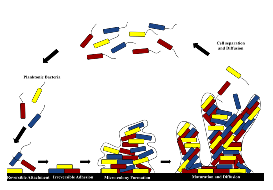 The development and growth processes of biofilms are continuing, ever-changing, and intricate procedures that work based on factors such as the matrix, culture media, essential cell properties, messenger molecules, cellular biomolecule processes, and hereditary regulation. The process of biofilm development comprises five consecutive stages and these stages are shown in Figure 1: