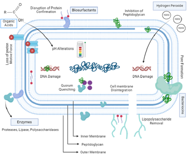 Biosurfactants derived from Lacticaseibacillus cultures effectively disrupted the pre-existing biofilms of S. aureus, E. coli, Bacillus subtilis, and P. aeruginosa [51]. These metabolites disrupt the cellular membranes, causing seepage and subsequent cellular apoptosis [52].