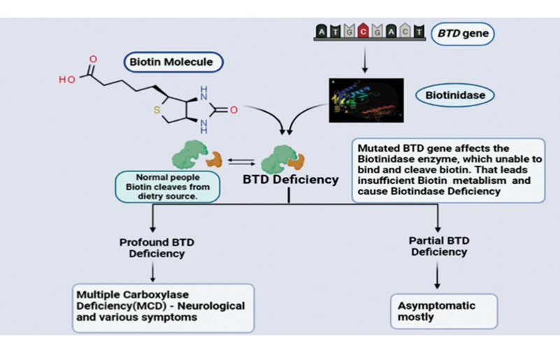 In addition to neurological symptoms including hypotonia, seizures, developmental delay, hearing loss, and optic atrophy at a young age, patients with extensive BTD also present with cutaneous symptoms such as dermatitis, conjunctivitis, and baldness. If left untreated, people may have metabolic decompensation, a coma, or even pass away. Children with autism or developmental delay may be misdiagnosed with partial BTD, and patients with partial BTD often show milder symptoms under stress later in life. Although neurological deficits are permanent once they occur, therapeutic doses of biotin (5–20 mg daily) can prevent the symptoms of Biotinidase deficiency [3]. It's noteworthy to note that the mandatory newborn screening (NBS) programs in the US and some other countries successfully cure or prevent the signs of BTD deficiency by supplying medicinal doses of biotin supplements [4].