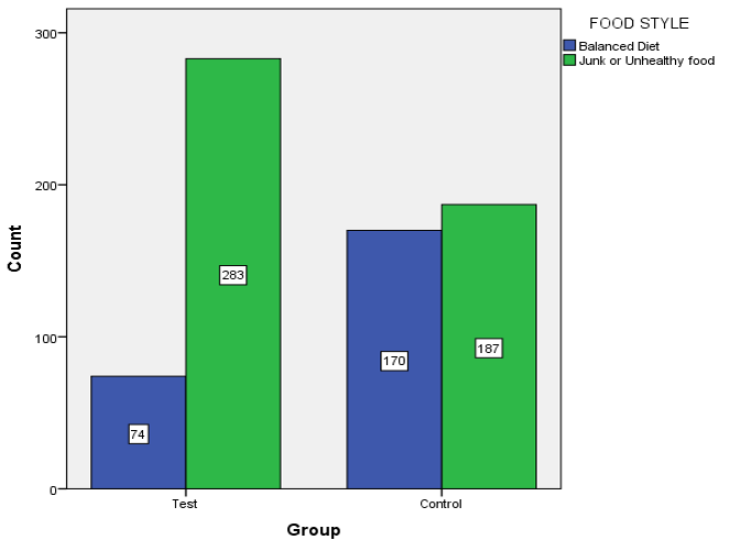 A total of 714 participants were recruited. Out of them, 357 test subjects had a family history of ESRD, and the remaining 357 were controls with no family history of ESRD (i.e., spouses were included). There is a significant statistical difference in the distribution based on family history as shown in Figure 1. A statistically significant proportion of test subjects 41.2% (n=147) had hypertension when compared to that of the control subjects 8.1% (n=29, χ2=104.995, p-value =0.000). Hereditary diabetes was seen among 26.6% and 6.2% of test and control respectively (χ2=54.473, p value=0.000). 20.7% were on a balanced diet, while 79.3% were not as shown in Figure 2. It was found that the percentage of alcohol consumption (26.1%) and smoking (21.3%) were higher in test subjects when compared to control subjects as shown in Figure 3. The distribution of test and control with respect to the positive response to regular exercise were 28.6% and 71.4% respectively (χ2=1.119, p-value = 0.290) as shown in Figure 4. The mean values of the serum creatinine in test subjects and control subjects were 2.16 ±0.66mg/dl and 0.93± 0.34mg/dl respectively (p value=0.000), this shows test subjects had increased levels of serum creatinine compared to controls. Mean DM was found to be 129.96 ± 30.74 mg/dl while, that of control subjects was 114 ± 45.82mg/dl. There was a statistically significant difference among the groups (p value=0.000). Likewise, the mean value of systolic hypertension in test and control was 140.1 ±19 and 123.7 ± 7.12mmHg and the diastolic BP of test and control was 86.23 ± 5.11 and 75.12± 4.91mmHg. A statistically significant difference among the groups was found (p value=0.04). Mean urine albumin in test and control were 26 ± 8.07and 13.23 ± 2.82mg respectively (p value=0.000) and the mean albumin-creatinine ratio of test and control were 29.87 ± 5mg and 19.13 ± 4.70mg (pvalue=0.000) as shown in Table 1. The results of both the urine albumin and albumin creatinine ratio showed that the test subjects had a higher chance of developing CKD compared to the control.