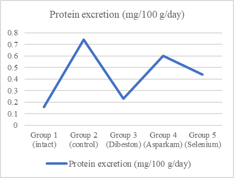 The development of alloxan diabetes was accompanied by renal manifestations: polyuria (7.34±0.60 ml/100 g versus 3.2±0.50 ml/100 g in intact patients), polydipsia, glucosuria, proteinuria, some decrease in glomerular filtration and reabsorption of water, increased blood creatinine (152.80±10.30 µmol/l versus 93.10±2.20 µmol/l in intact rats). The use of mineral additives reduced the severity of polyuria (Figure 2), polydipsia (especially pronounced in the Dibeston and Asparkam groups, in which diuresis was, respectively, 2.00±0.24 ml/100 g and 1.48 ml/100 g), glucosuria. In addition, the use of hyposol led to a significant decrease in proteinuria (protein excretion per day 0.24±0.02 mg/100 g versus 0.75±0.27 mg/100 g in group 2) (Figure 3).