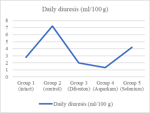 A 10% aqueous solution of alloxanhydrate was administered subcutaneously at a dose of 100 mg/kg, after which the use of mineral compositions was continued for another 10 days. Then the animals were placed in exchange cages for 24 hours, after which they were slaughtered. Daily diuresis, drinking activity, protein content in urine, glucose, and creatinine in blood and urine were determined, and glomerular filtration rate and water reabsorption were calculated according to standard methods [27-30]. Statistical processing was carried out using the program "Statistics".